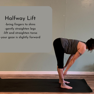 Halfway Lift - (inhale) bring your fingertips to your shins, and lift your torso just enough to straighten your spine.